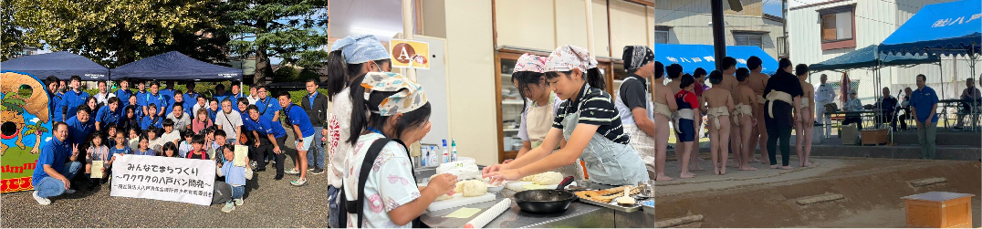 八戸三社大祭開催期間、八戸市庁前にておまつり広場の企画・運営をしています。2023年5月より新型コロナウイルスが5類感染症へと移行し、通常通りのおまつりが開催されました。おまつりを楽しみにされている市民の皆様や子どもたちに喜んでもらえるように、縁日やお化け屋敷などおまつり体験パークの開催をしています。
