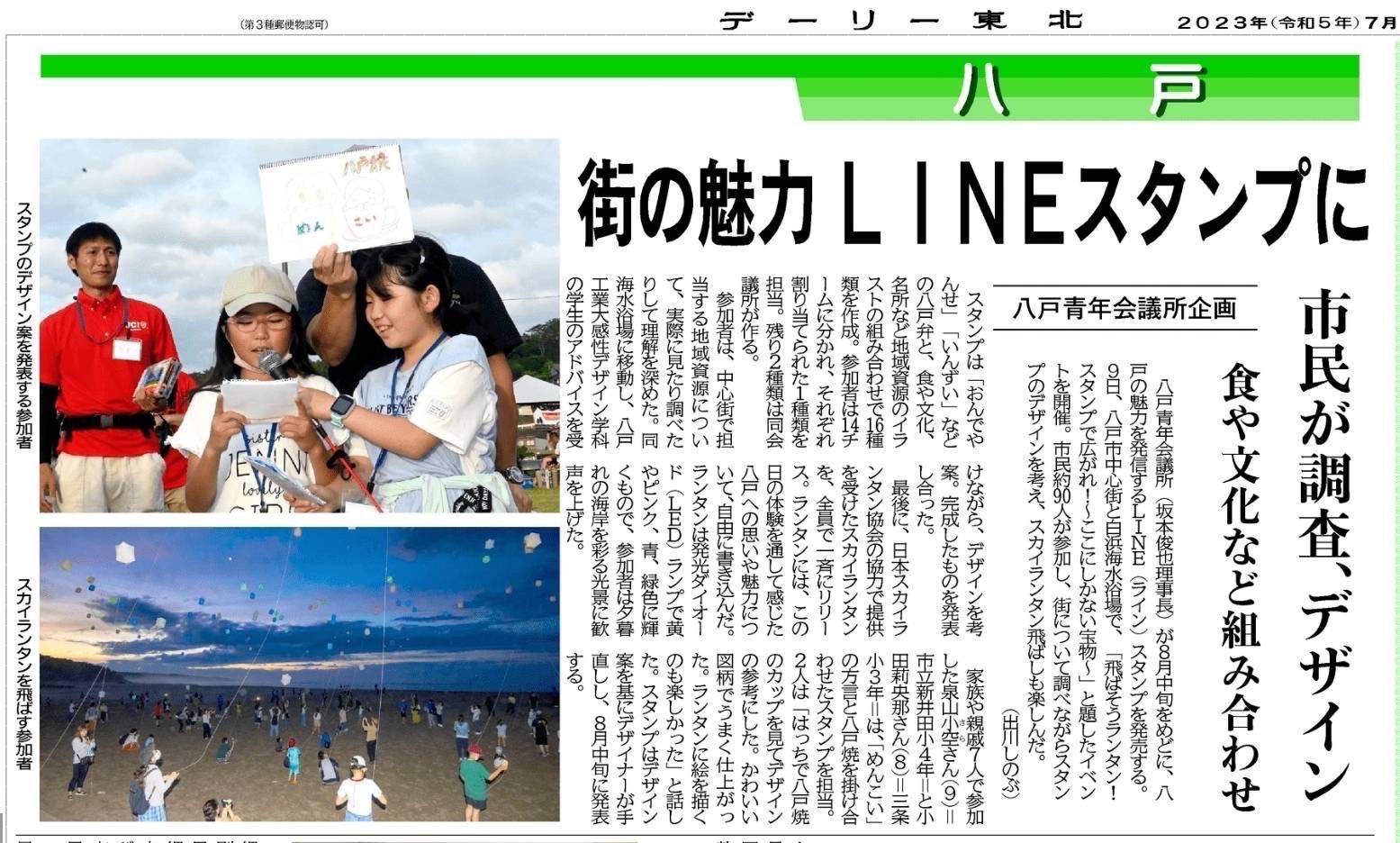 八戸の魅力を詰め込んだLINEスタンプのデザインを考えるにあたり、セリフと掛け合わせる八戸の魅力をチームごとに決め、イメージを膨らませるために街歩きをしました。八戸工業大学感性デザイン学部感性デザイン学科の学生のご協力もいただきながら、各チームがユニークでついつい使いたくなるようなデザインを作り上げていただきました!最後には白浜海水浴場にて、最高の天候の中、みなさんの想いを乗せた100基のスカイランタンを一斉リリースし、みなさんとともに感動を共有することができました。